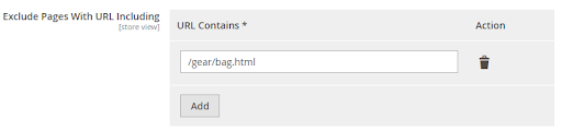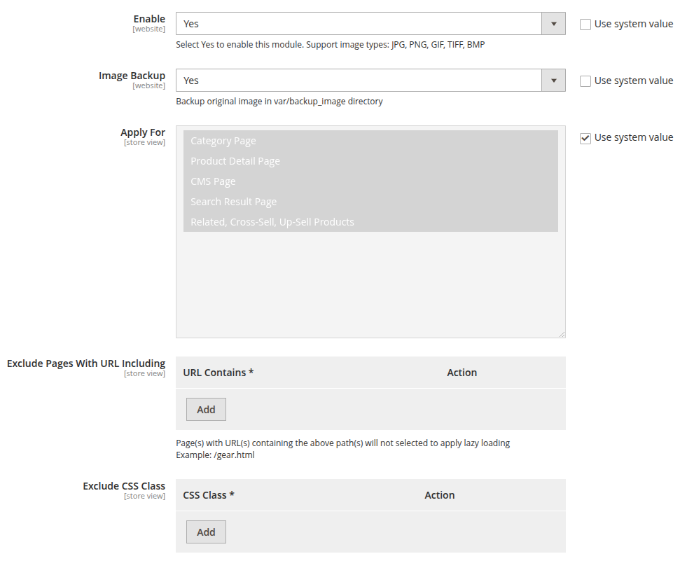 - Exclude Pages With URL Including: Click Add button to enter the path of the page that you do not want to apply lazy loading. Pages with URLs entered in this field will not apply lazy loading. Click Delete icon to delete the path you have just entered.