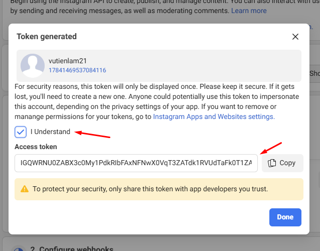 Step 14: Click the checkbox I Understand to have permission to view and copy access token.