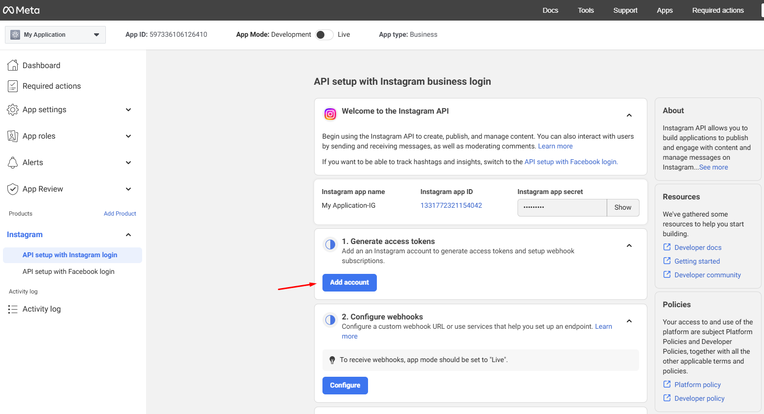 Step 8: Now, you have successfully created your application. After that, you can set up Instagram products on your app by clicking Set up or Add Product button.
