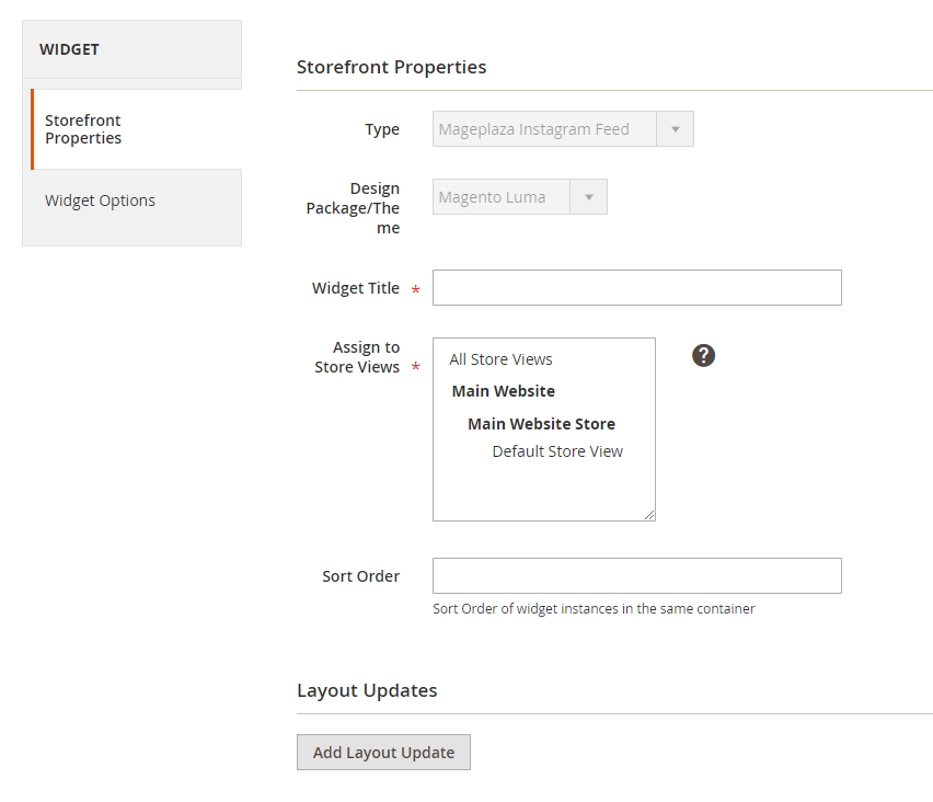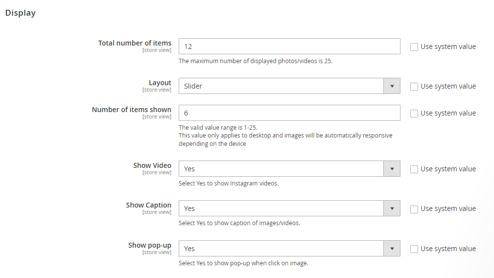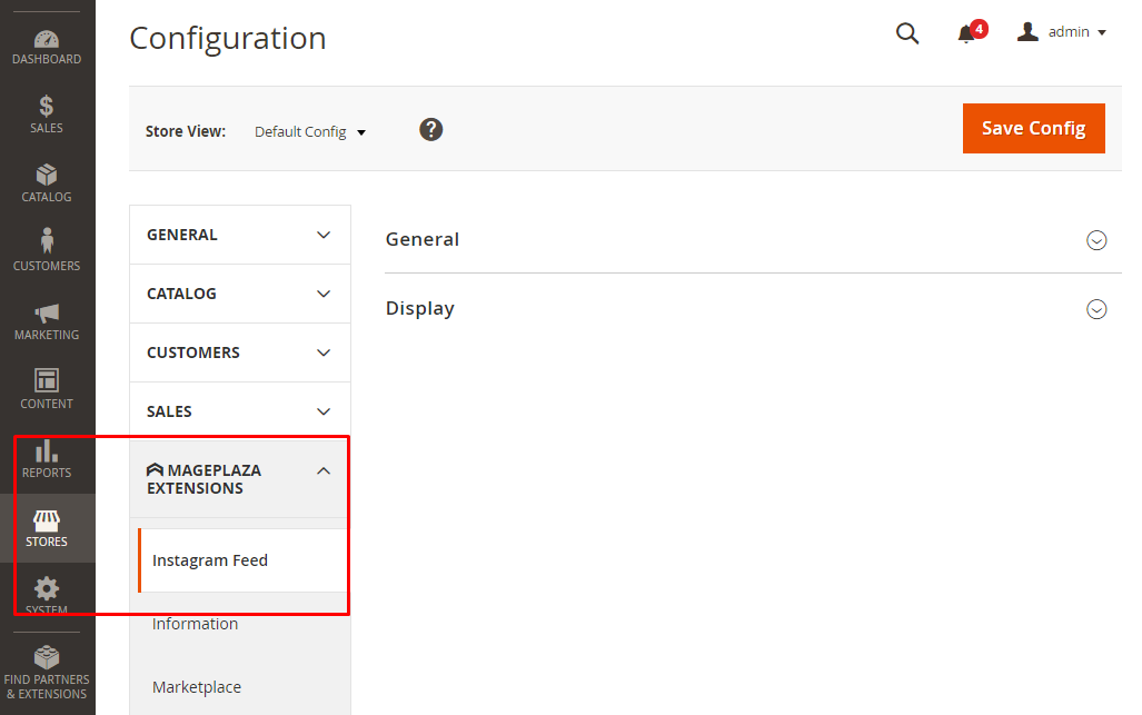 From the Admin Panel, go to Store > Settings > Configuration > MAGEPLAZA EXTENSIONS > Instagram Feed