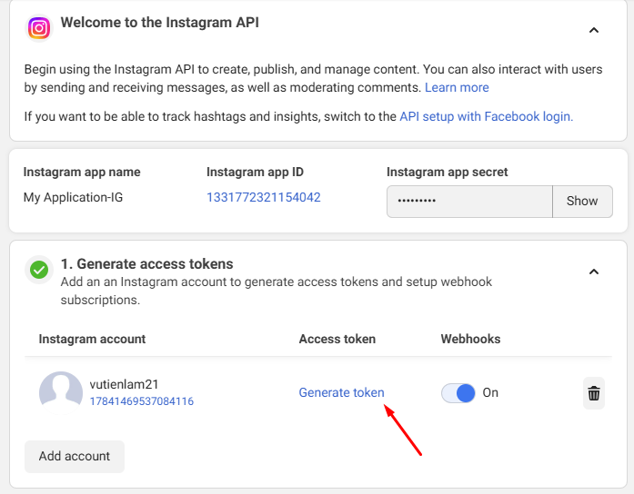 Step 13: Once you add your Instagram account completely, click Generate Token hyperlink.