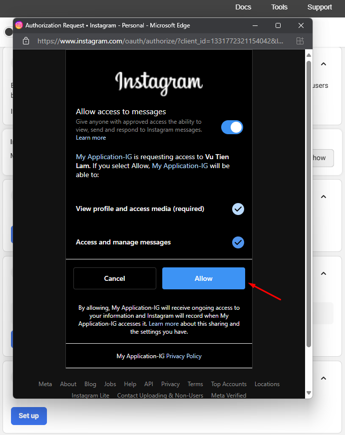 Step 12: After login successfully, click the Allow button to grant Instagram access to tester role account data.