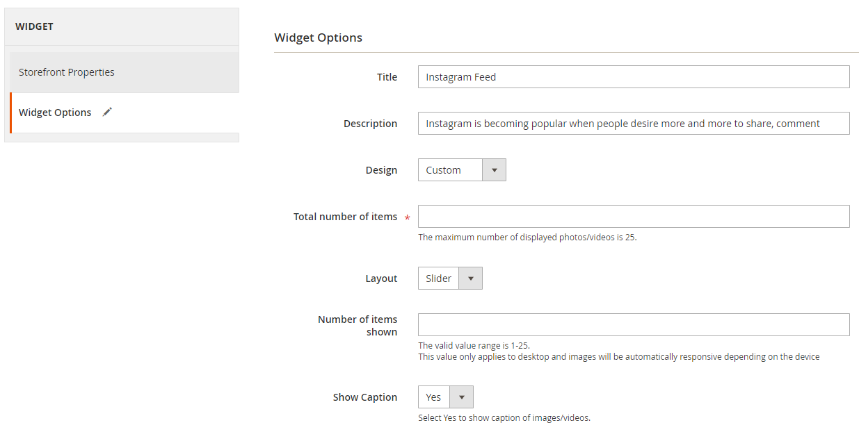The Instagram Feed supports displaying your Instagram photos on the homepage, product page, or CMS page within your sites. You can also configure the number of images per row and the maximum number of images displayed. Images can be sorted and arranged randomly according to the most recent, most liked, and most comments.