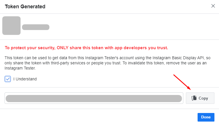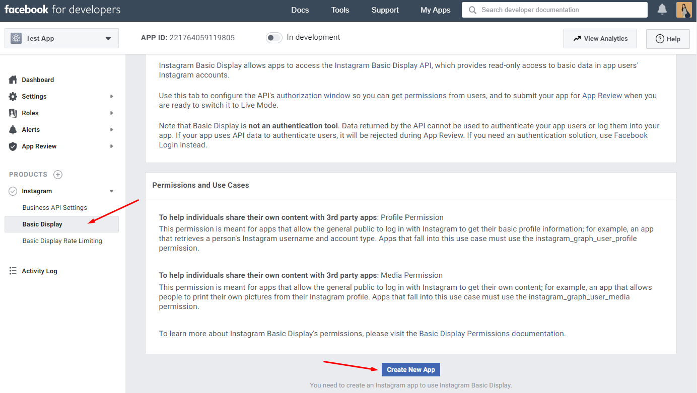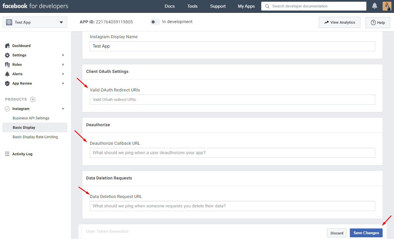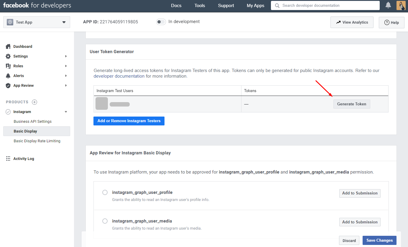Instagram > Basic Display. In the User Token Generator field, click on Generate Token