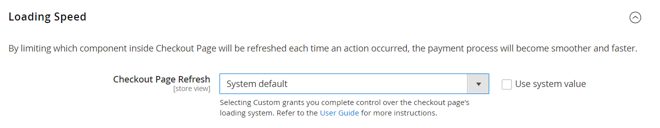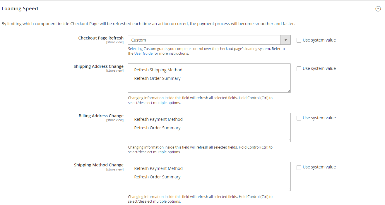 Any modifications made to the checkout page cause all of the blocks to reload according to Magento's default logic. This slows down the page loading speed and makes customers wait longer. The Mageplaza One Step Checkout module has improved this by creating the Loading Speed Optimization feature which allows the admin to configure each block on the checkout page to choose when to refresh or not refresh based on specific requirements of the store.