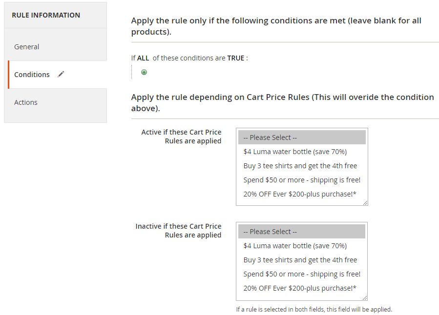 Cart Price Rules, this rule will not be applied to the Payment Restriction without checking the applicable conditions of the selection above. - If one or more rules is selected at the same time in the both