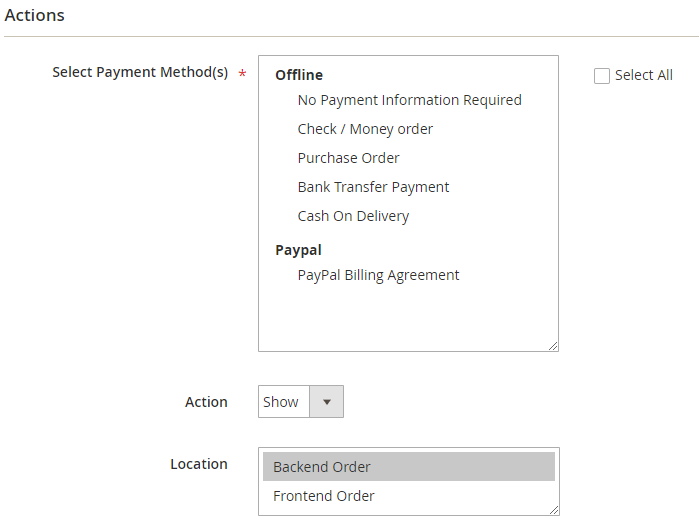 - Select Payment Methods: Choose the payment method to apply the rule. You can choose more or all payment methods to show all