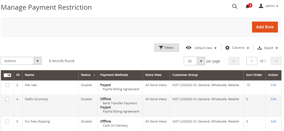 - This section will record all created rules with the basic information as Name, Status, Method, Store view, Customer Groups, etc