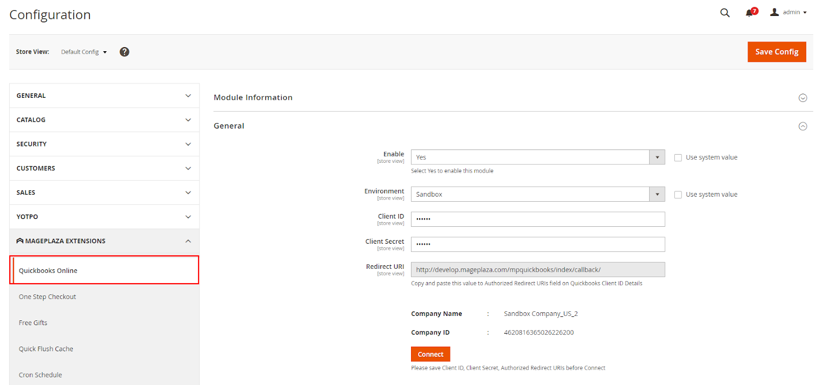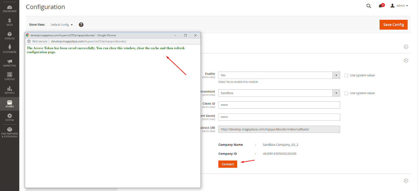 - Admin can get Company Name and Company ID to check the connection with Quickbooks Online by clicking Connect button and choose the Company Name you want to sync. After that, you will see a successful notification. You should close the current tab then return to Quickbooks Online to configure the module