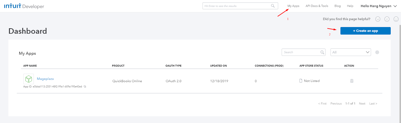 - After registering an account, visit this link to get your API login information. The select My Apps and click to Create an app. There provided with Client Id and Client Secret you need save it to be able to connect with Quickbooks Online later.