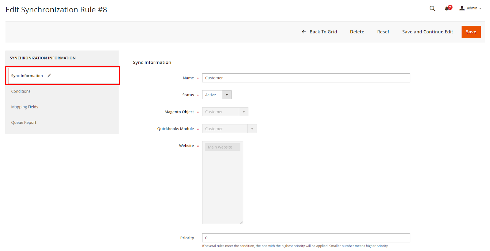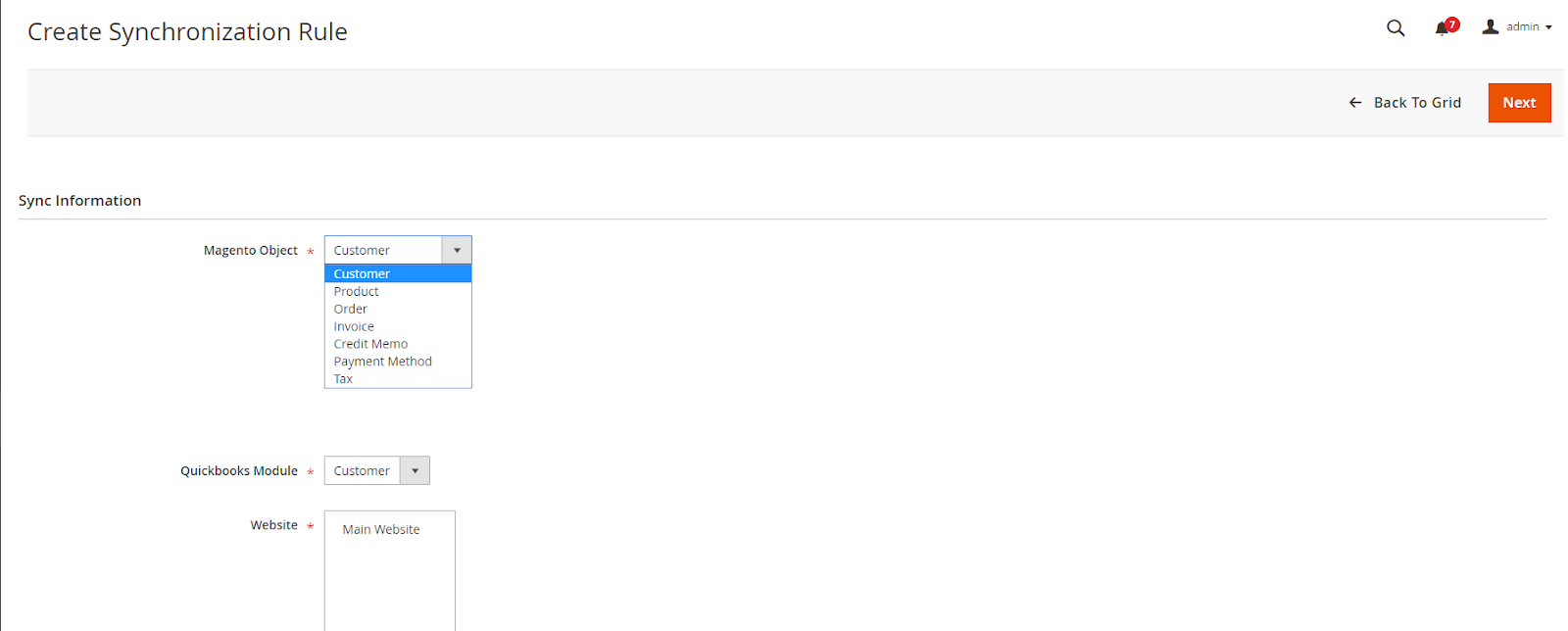 - Data of Magento Object, Quickbooks Module, Website are taken according to the object data above before creating sync rules and can only be changed when admin changes object information before creating.
