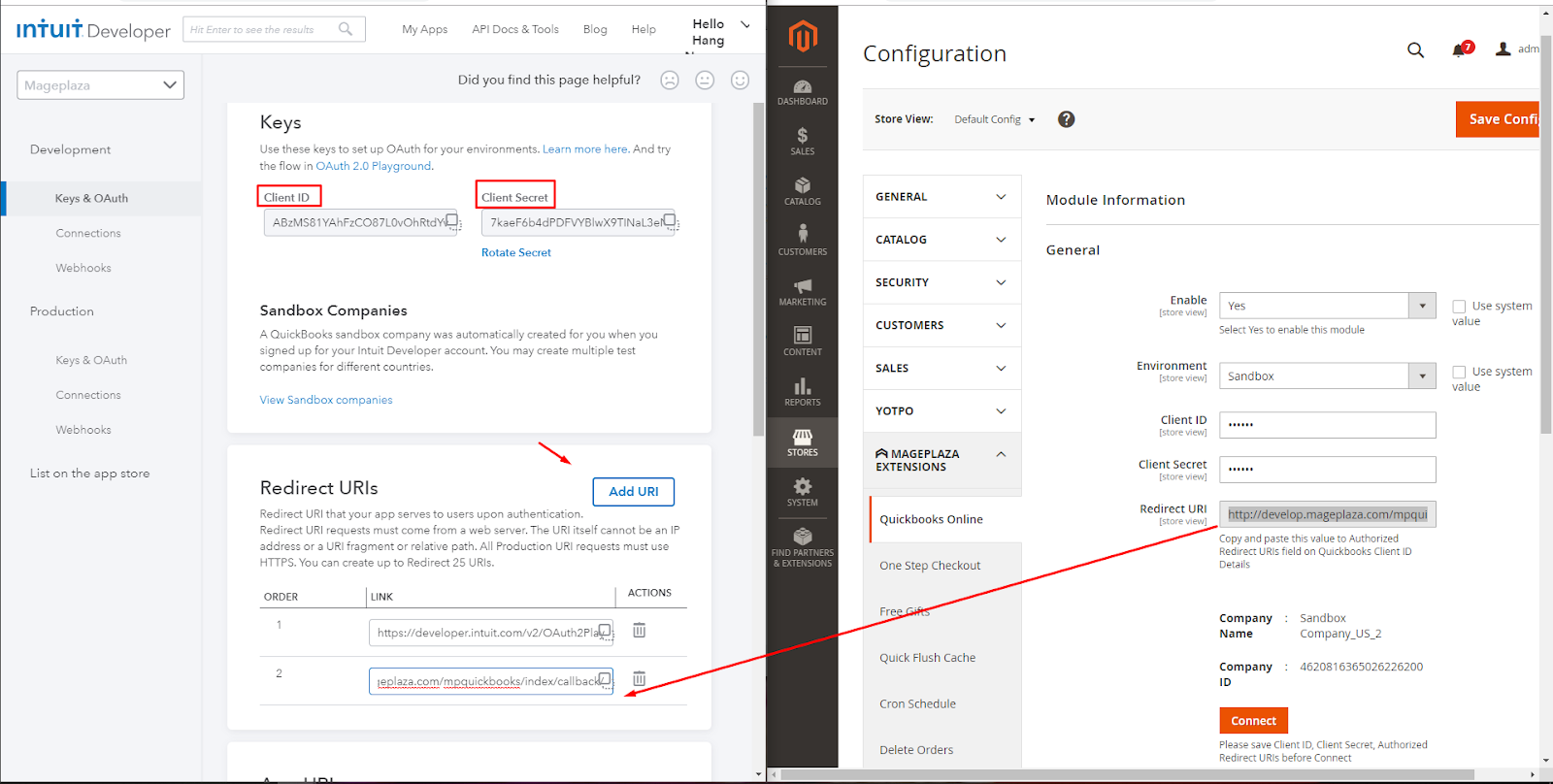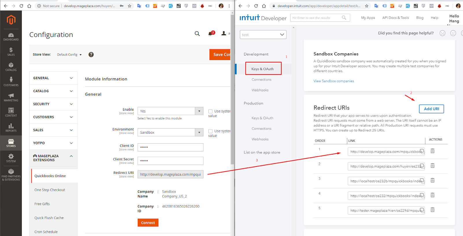 - Accessing the Key & OAuth tab, you can get Client ID and Client Secret information. Click the Add URI button and copy the Redirect URIs value available in Mageplaza's Quickbooks Online to fill out.