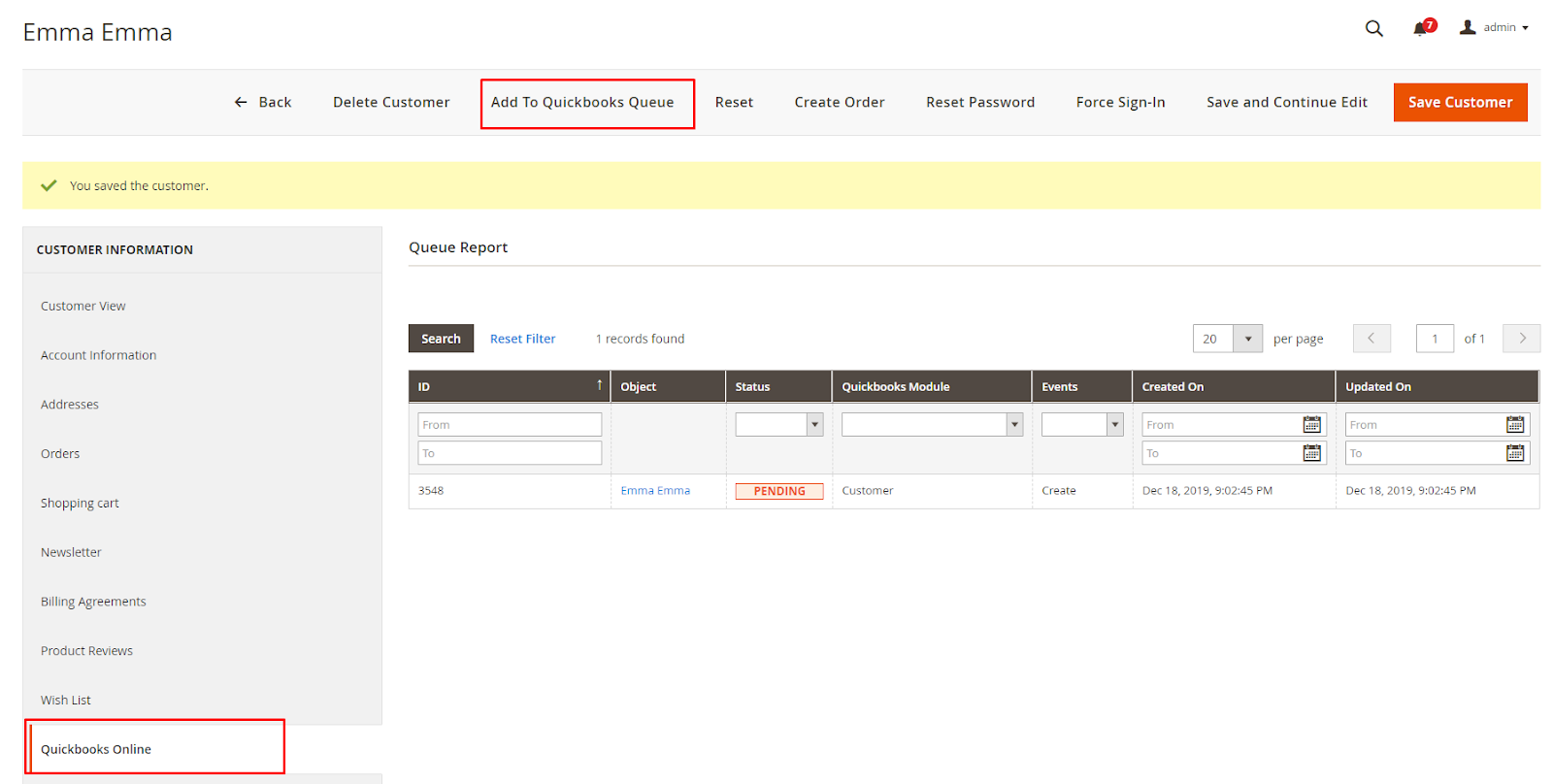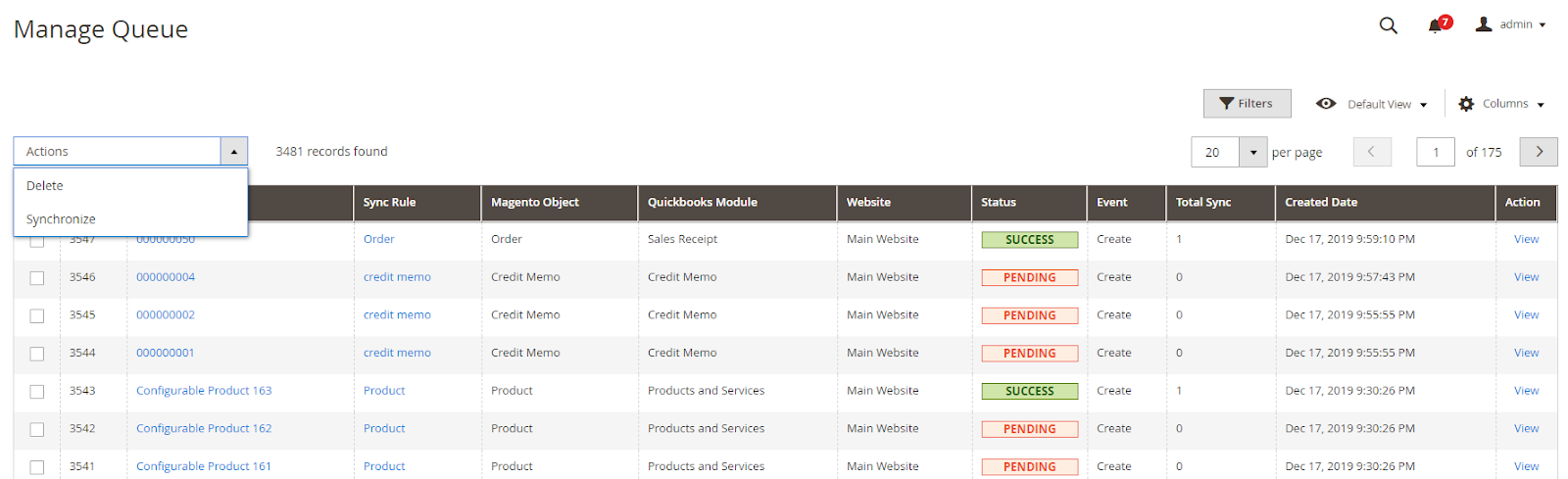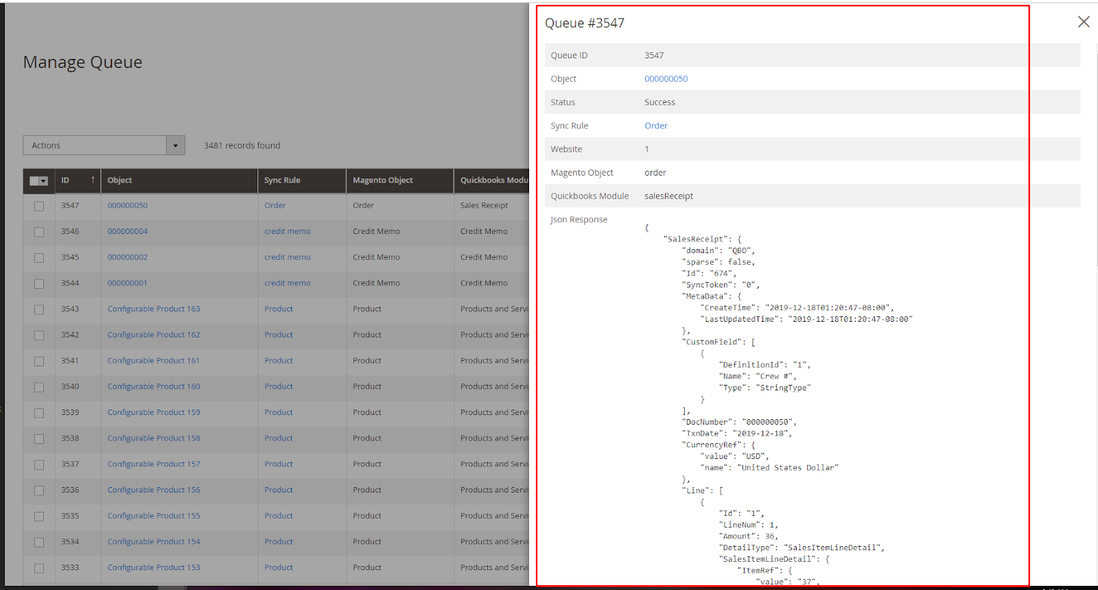 - This section records the information of Queue including Object, Sync Rule, Magento Object, Quickbooks Module, and so on.