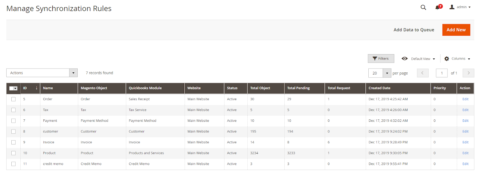 Here, the Sync Rules information includes the Name, Magento Object, Quickbooks Module, Website, Total Objects, Total Request (include error and success statuses), Total Pending, etc.