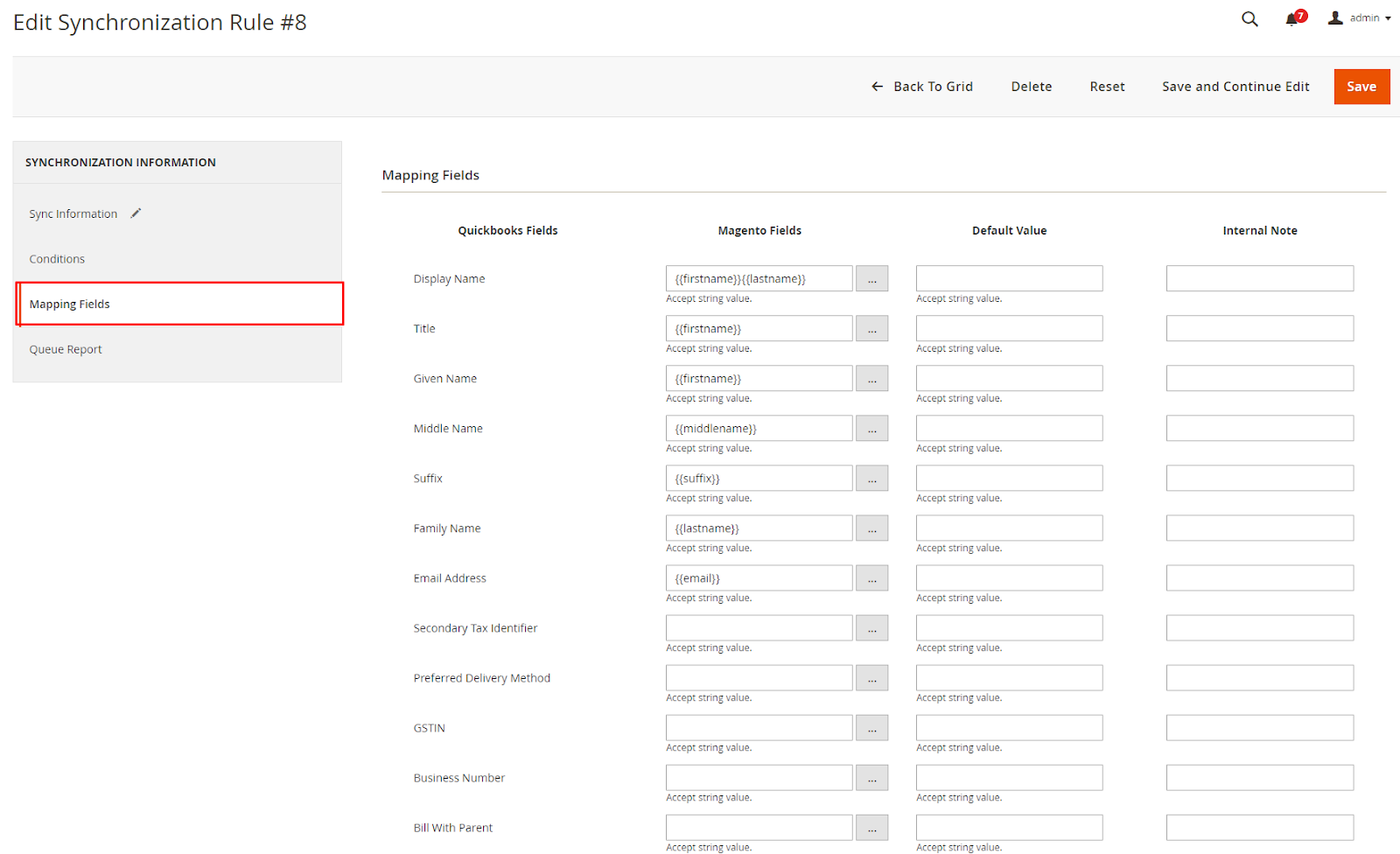 - Enter the fields of the corresponding Magento object to upload data with the fields of Quickbooks Module.