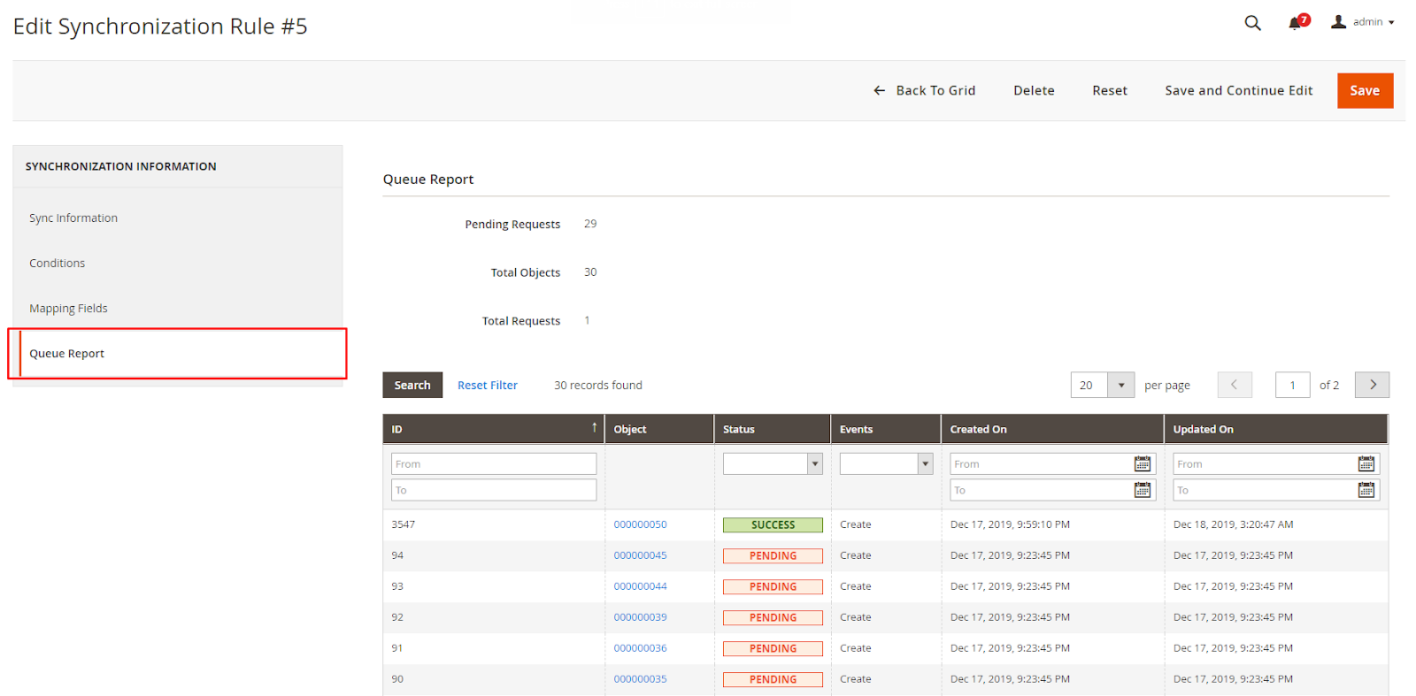 - Select Add Data to Queue if you want to add more data to Queue. Or with Mass Actions, admin can synchronize one or more rules at the same time when clicking Add To Queue.