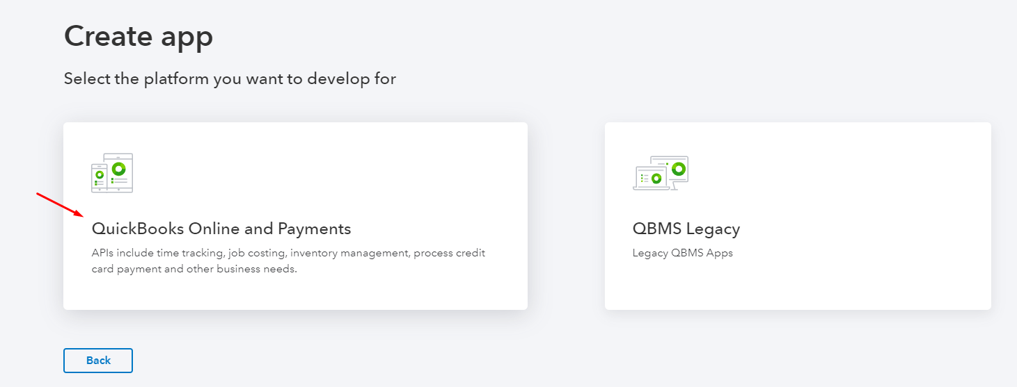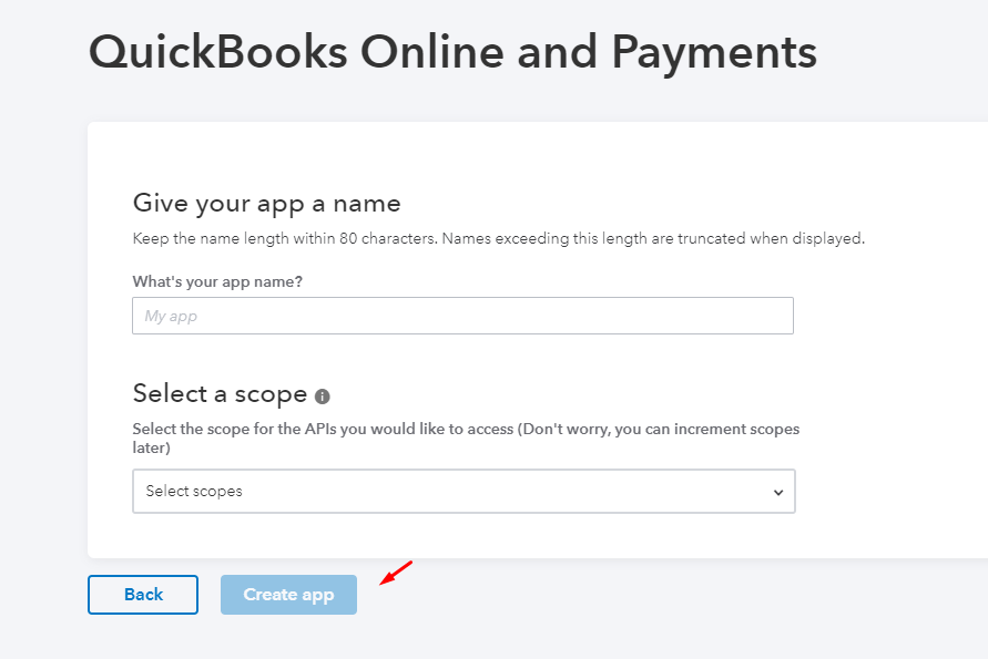 - Select QuickBooks Online and Payment. Then enter the required information and click Create app to start creating the app.
