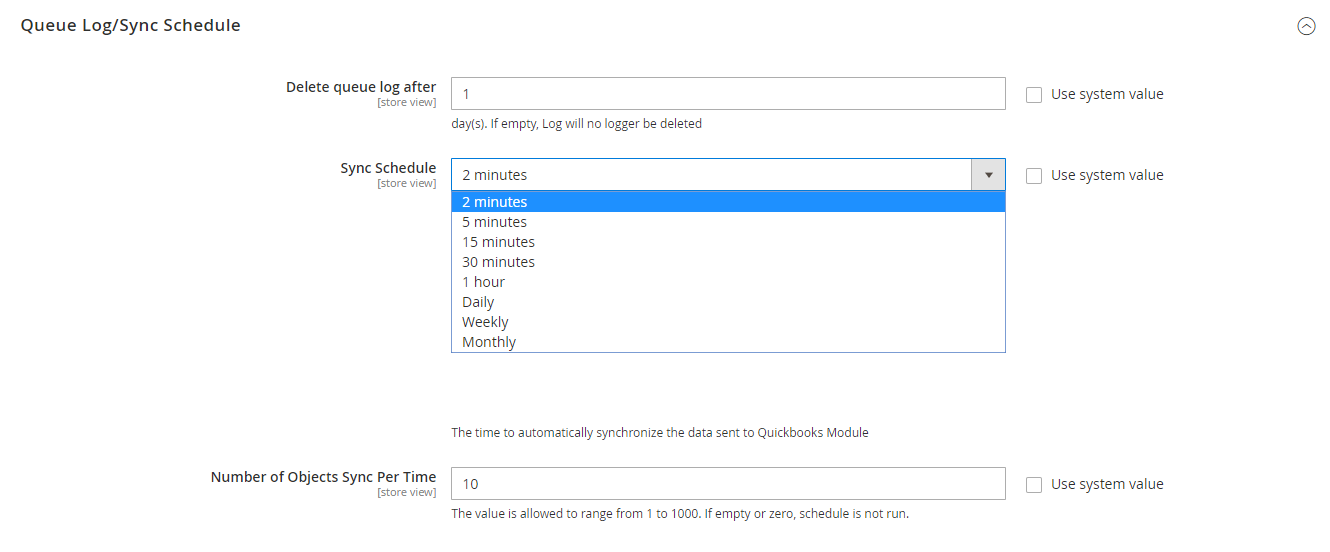 Sync schedule: Select the time to send data to Quickbooks Online automatically. Any Magento objects changes will be sent to Quickbooks Online; otherwise, the unchanged data will not be sent to Quickbooks Online anymore.