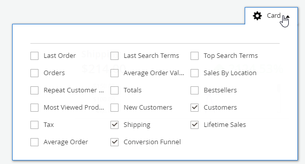 - Each chart is represented by 1 card. Admin can adjust dashboard with cards provided by the module