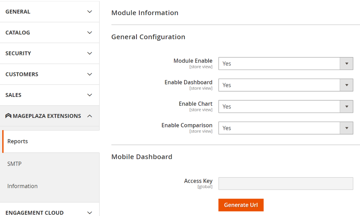 Yesto enable this module. - Enable Dashboard: Choose Yes to display Mageplaza Report extension at Dashboard
