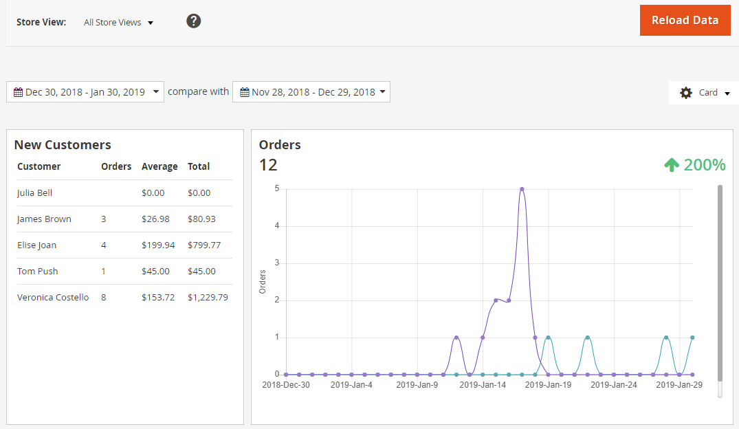 Having the newest insights of your store will never be easier, Magento 2 Reports is crafted as a reliable analyzing tool which assembles and performs your business operations onto easy-to-understand line charts. Thus, by keeping track precise collected data will definitely help you assess your business/campaign/program and flexibly adapt to new situations quickly.