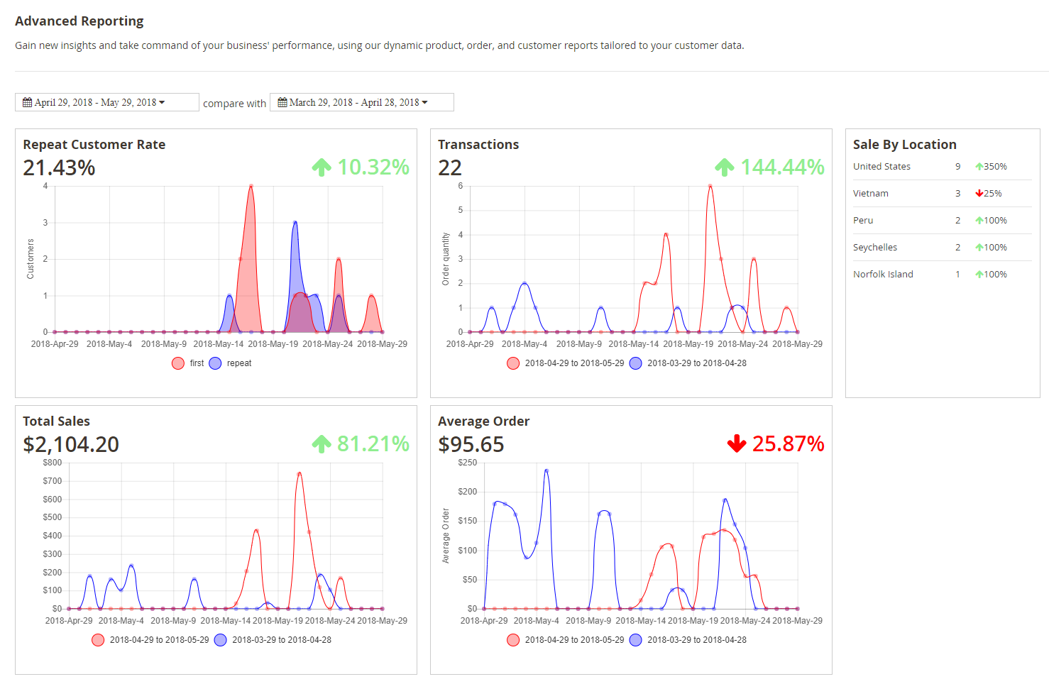 In this extension, all the reports will use line graphs, which are fond of showing data variables and factors clearly. Advanced reports will be executed after scanning all sales records, display each of a specific variable into a line then perform its movement corresponding scanned records. Besides that, this module also helps store owners manage and follow the growth rate or the decreasing rate compared with the same period last month, last year, etc.