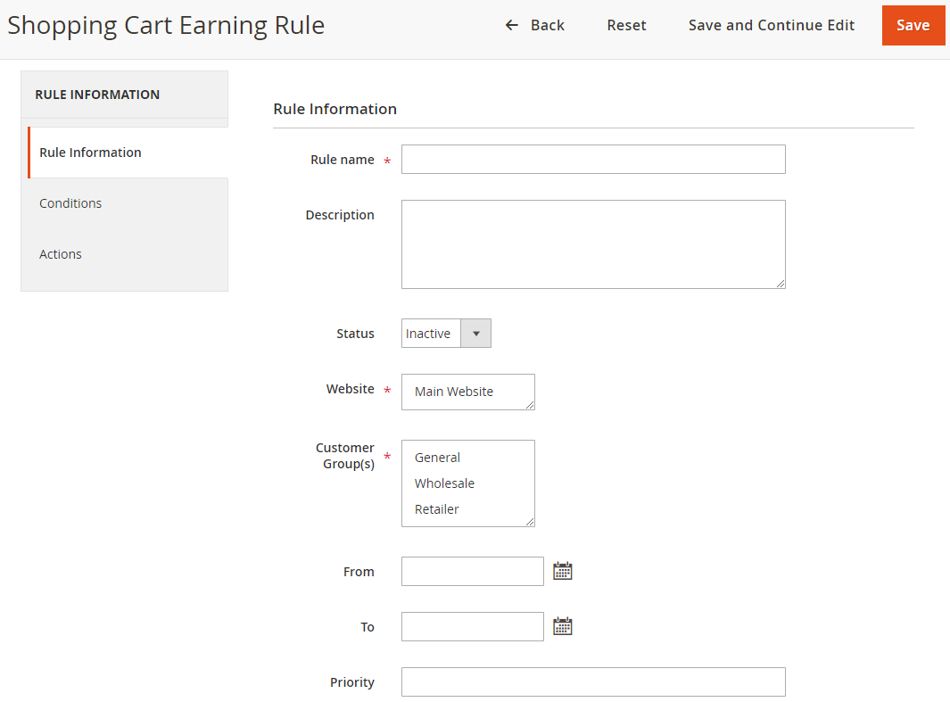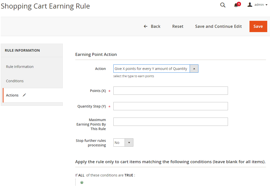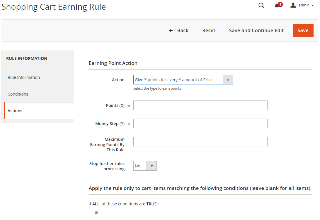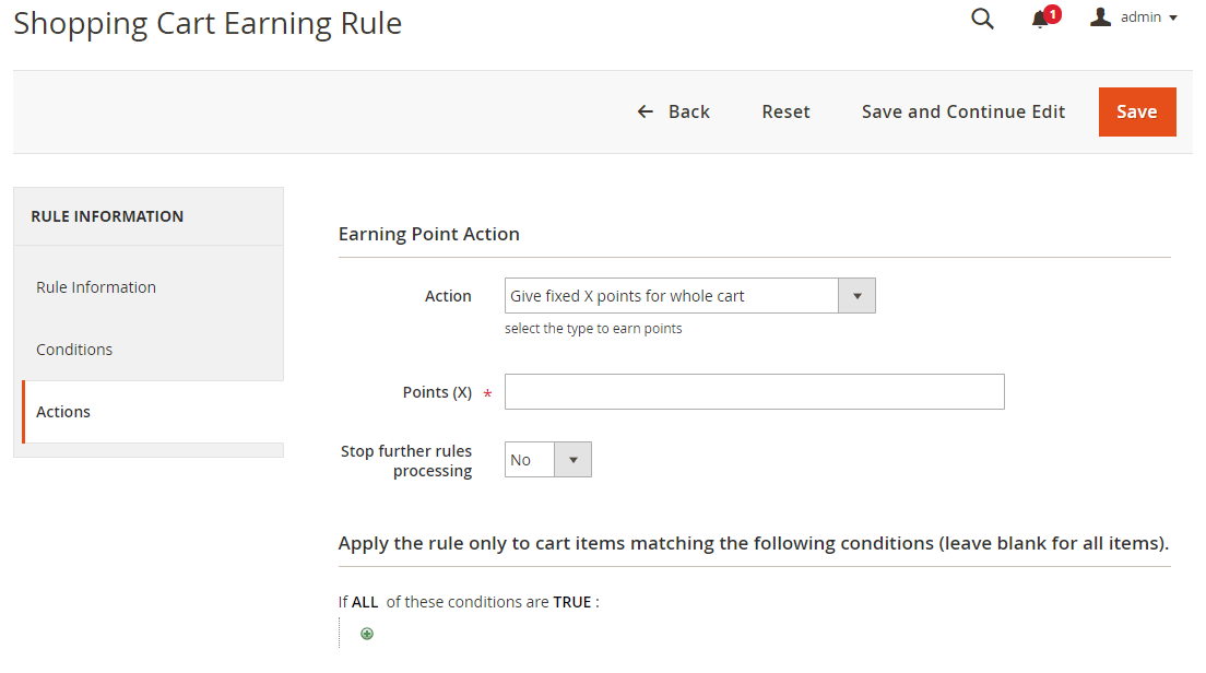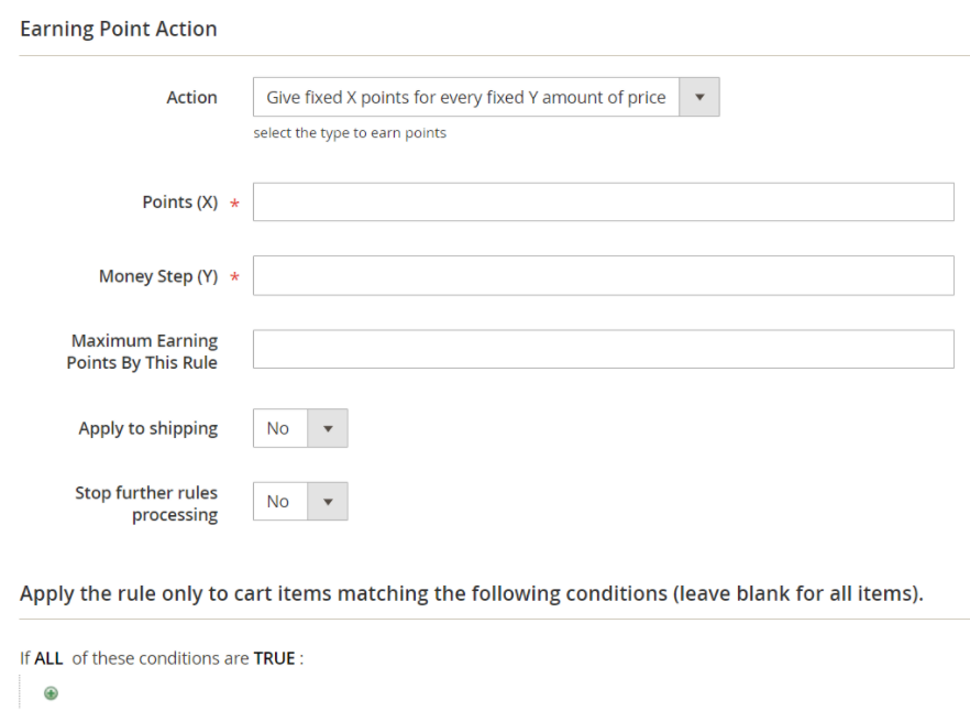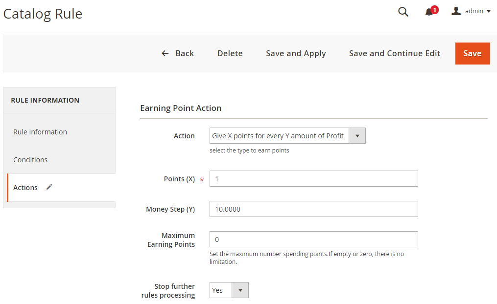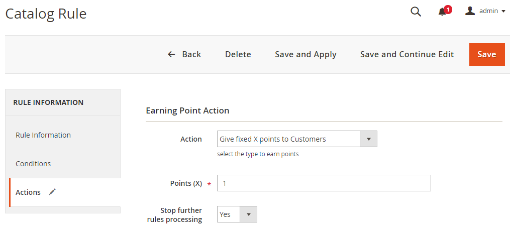 Admins can add new or edit Catalog Earning Rules in this section. Customers can receive points if they buy products that meet the conditions set in the Rule.