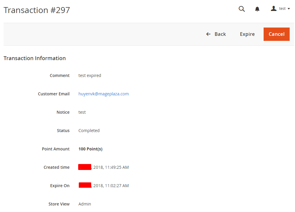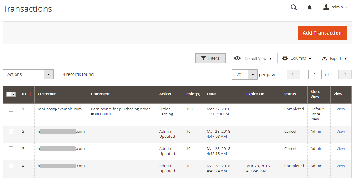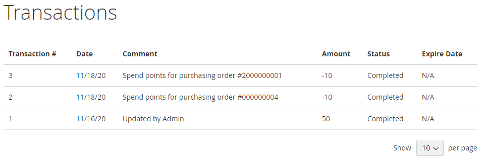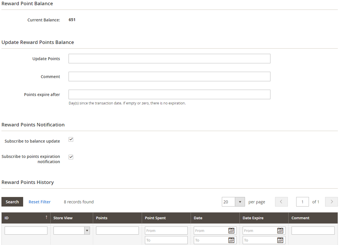 - In the Reward Points History grid: Displays information about all executed transactions: ID, Store View, Point, Point Spend, Date, Date Expired, Comment.