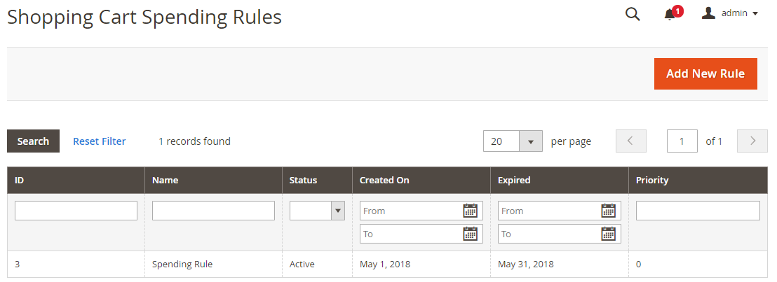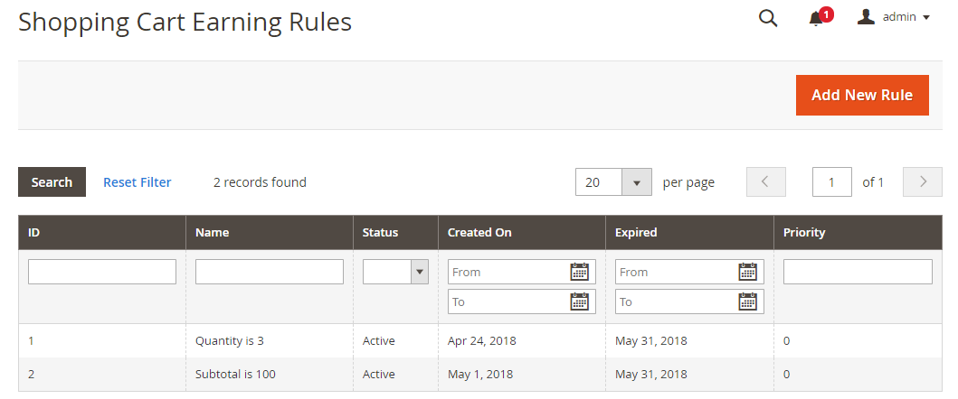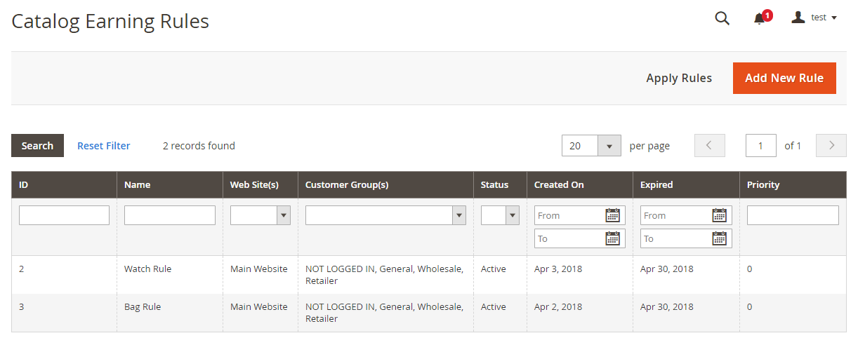 - From the grid view, admins can acknowledge some fundamental information of a catalog earning rules such as ID, Name, Website, Customer Group, Status, Create On, Expired, and Priority.