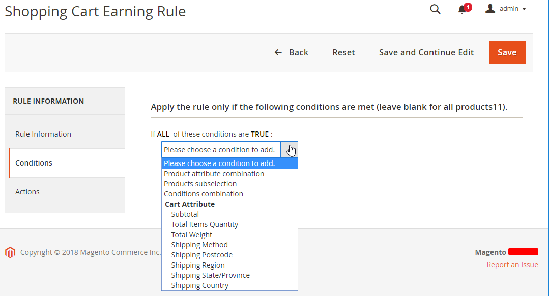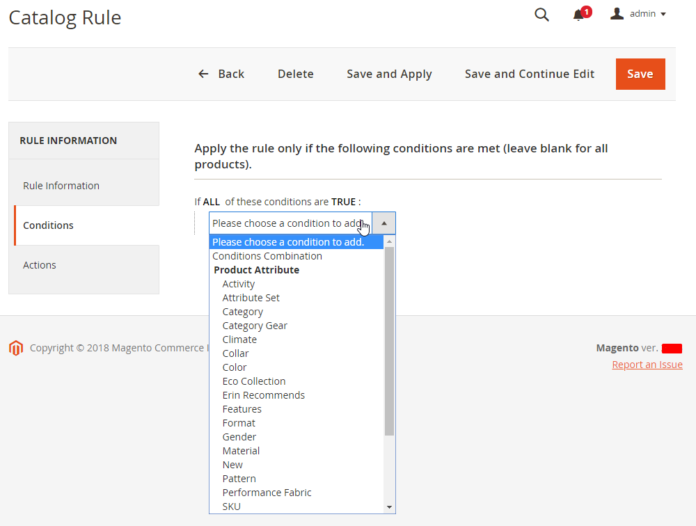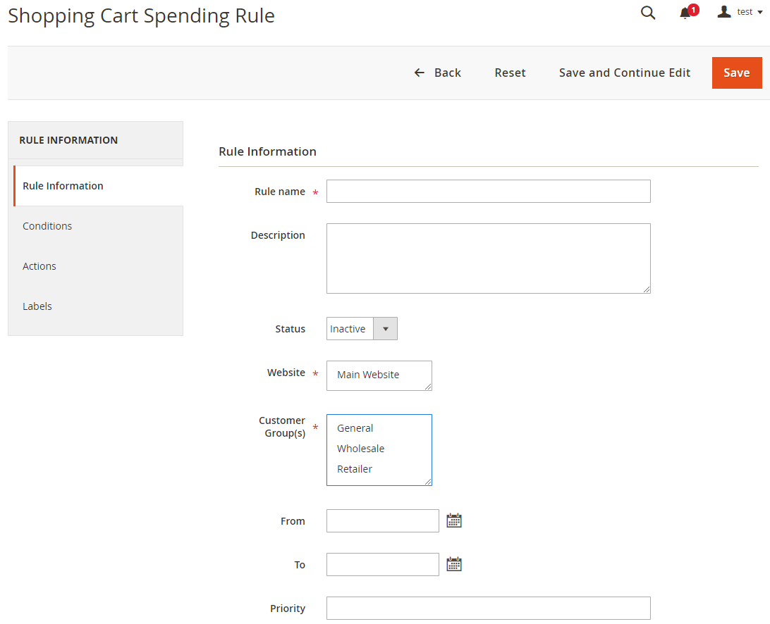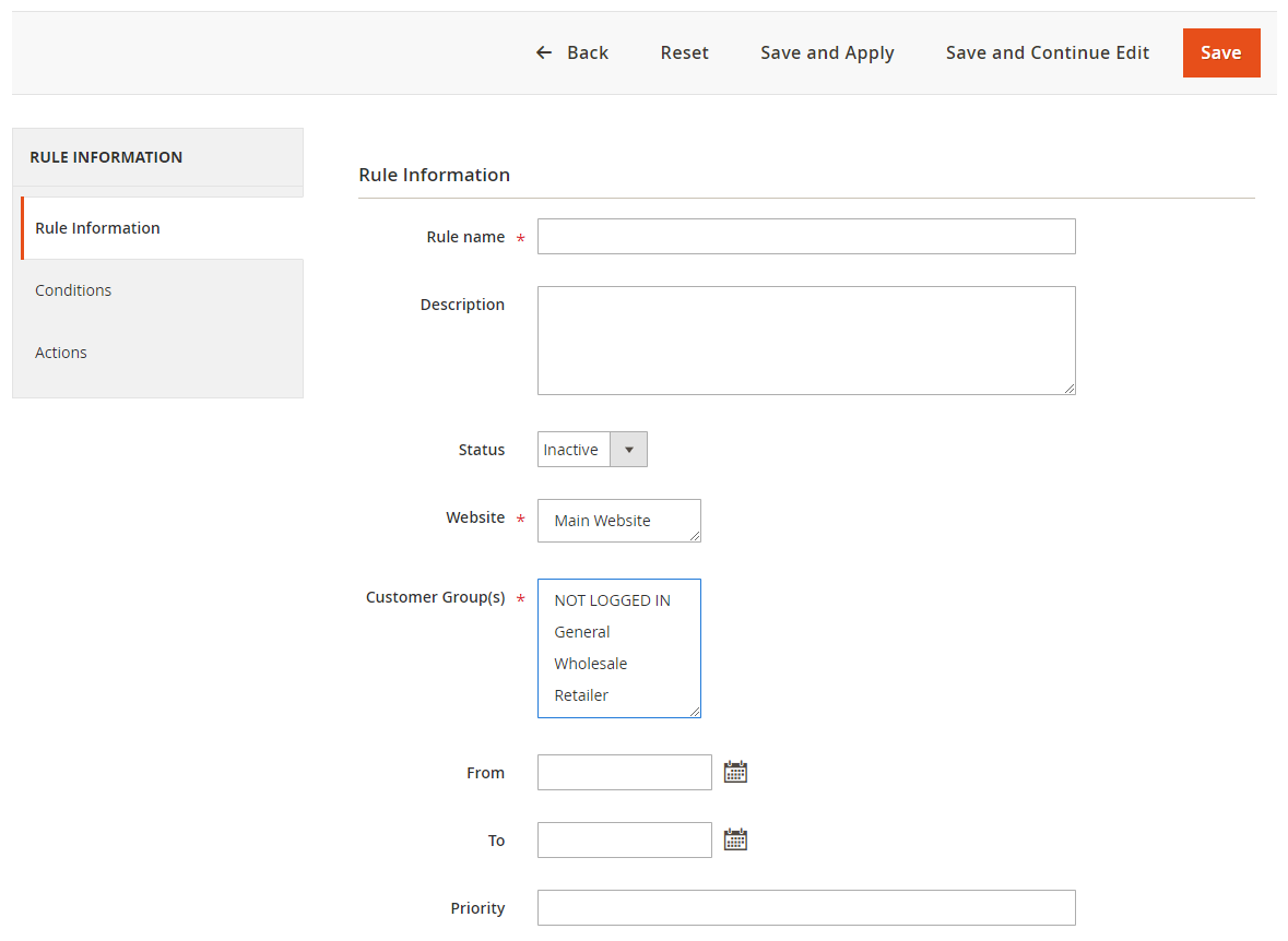 Add New Ruleat the right-above corner to create a new catalog rule, after clickingSave and Continue Edit, the page will be directed to the Edit Rate page - At the Add New Rule page, click on