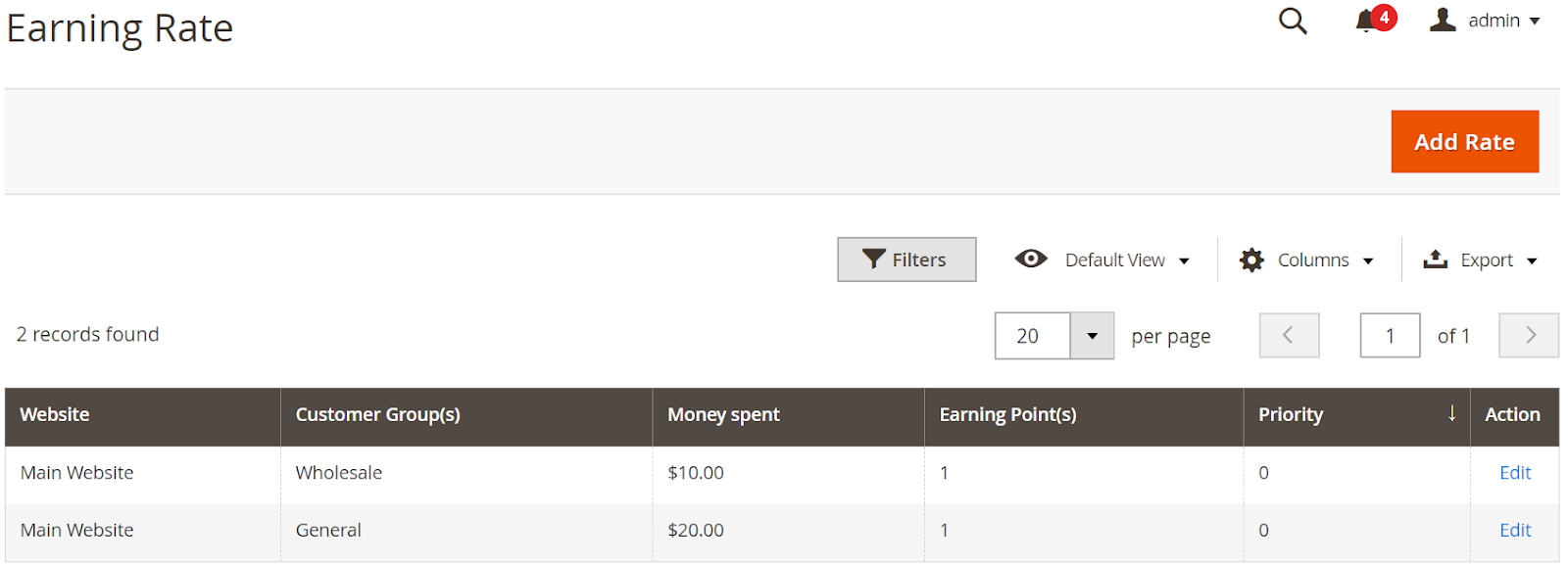 - From the grid view, admins can acknowledge some fundamental information of Earning Rate such as ID, Website, Customer Group, Money Spent, Earning Point and Priority. Also, admins are able to: