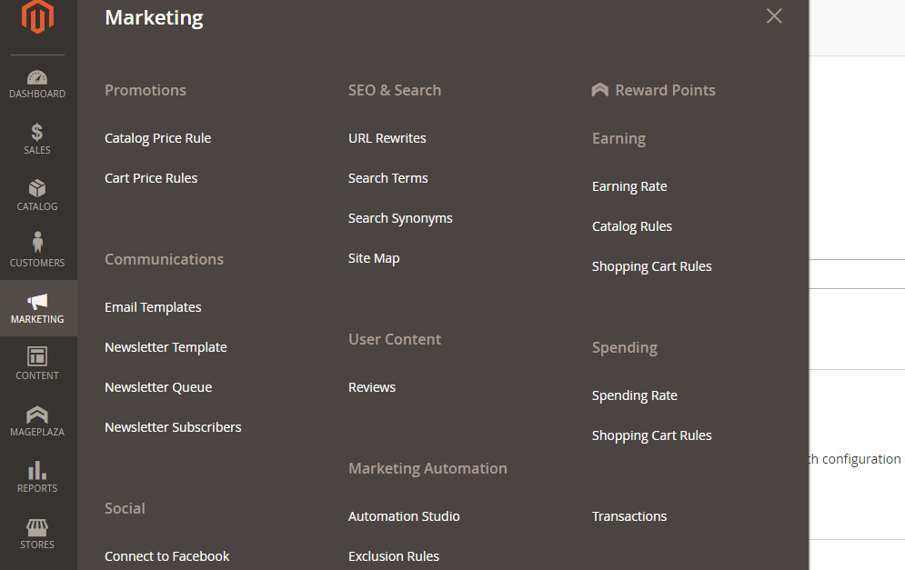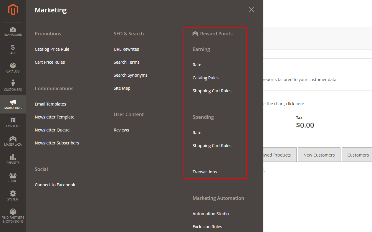 Log in to your backend, then go to Marketing > Reward Points and follow the instructions below to configure Reward Points extension