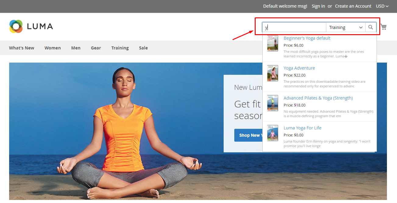 - Depending on the configuration in the backend, the search result will display the product name, product thumbnail image, price, and short description.