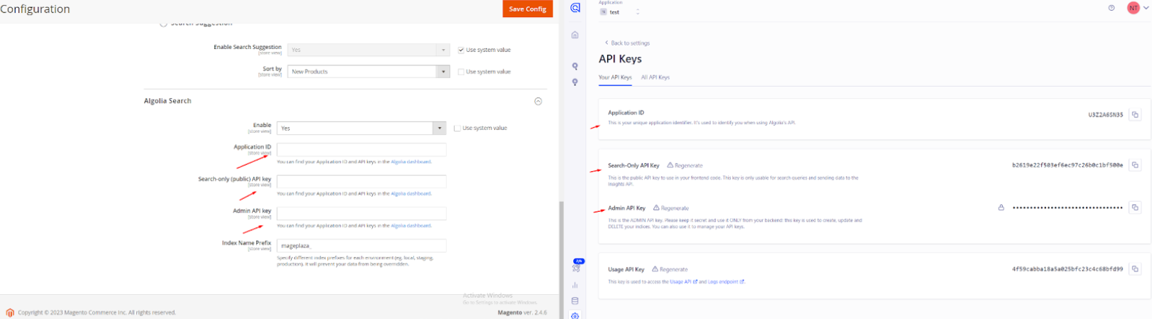 Insert the key just created above to enter values into these fields: Application ID, Search-Only API Key, Admin API key.