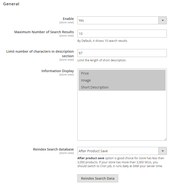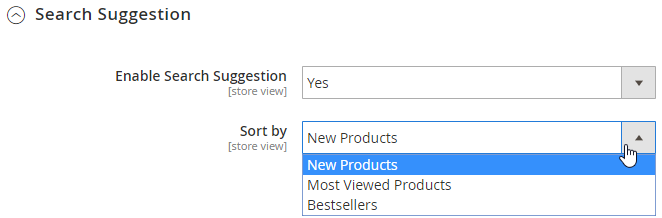 Enable Search Suggestion = Yes - There are 3 types to sort the products: New Products, Most View Products, and Bestsellers