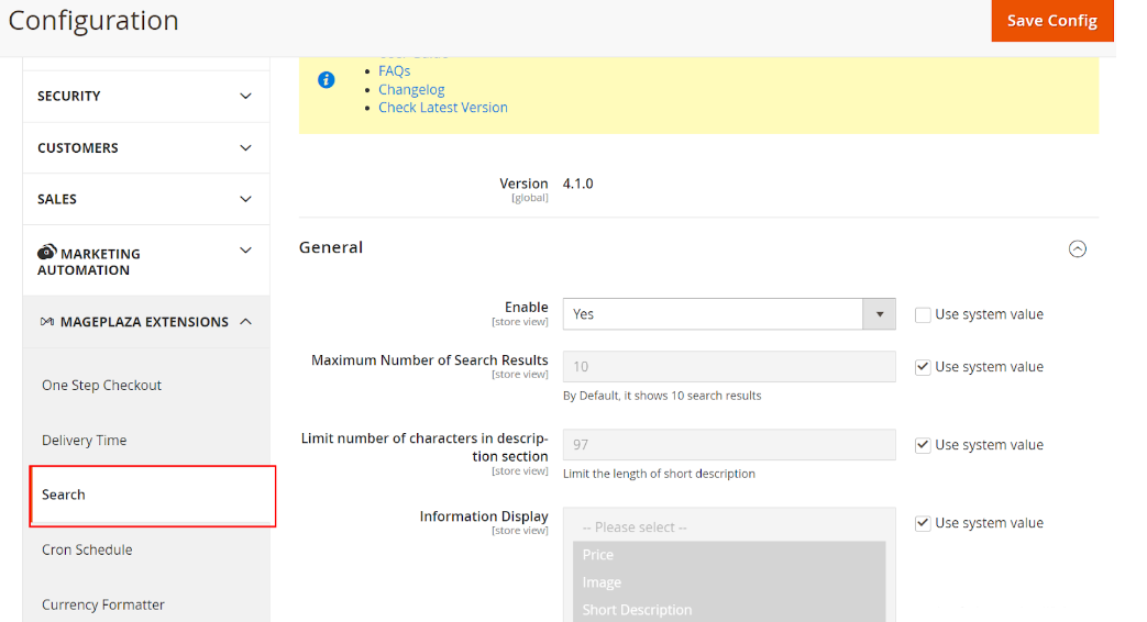 After logging in to your Magento Admin, choose Store > Settings > Configuration > Mageplaza Extensions > Search