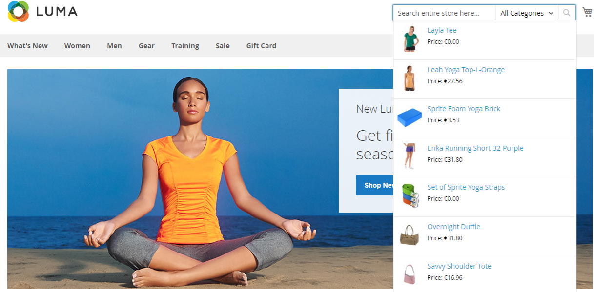 - Depending on the configuration in the backend, the search result will display the product name, product thumbnail image, price, and short description.