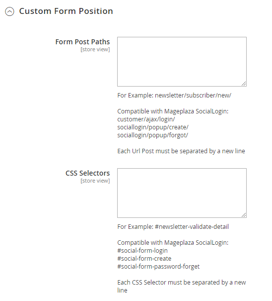 - In the Custom Form Position field, if you want to show reCAPTCHA on the form you want, you have to fill in all information of 2 fields: Form Post Paths and CSS Selectors.