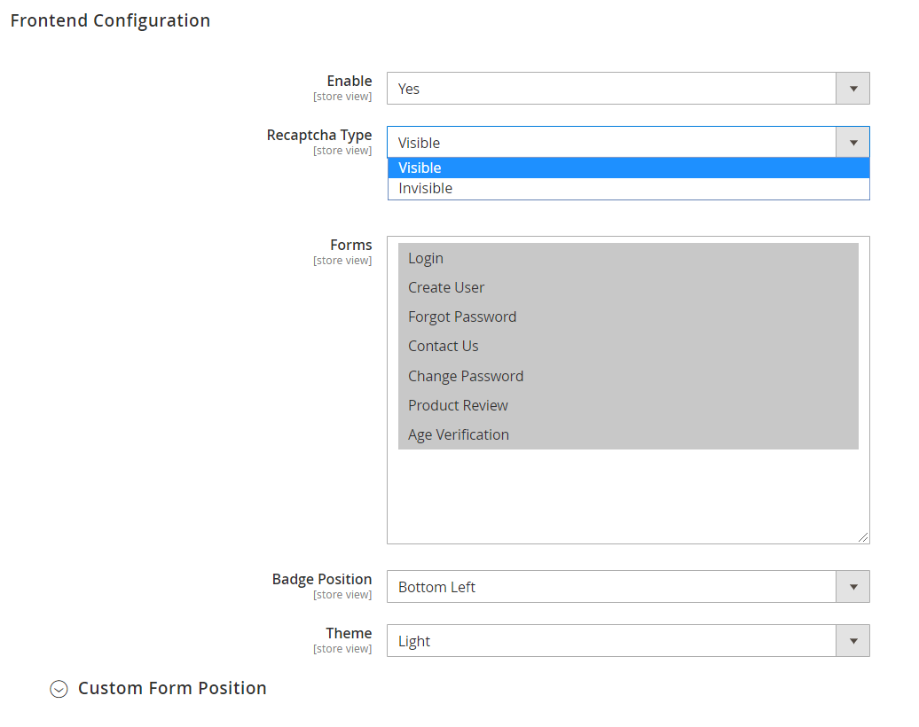 - Forms: Choose a place displaying the reCAPTCHA. Store owners can allow reCAPTCHA to display in 2 forms:
