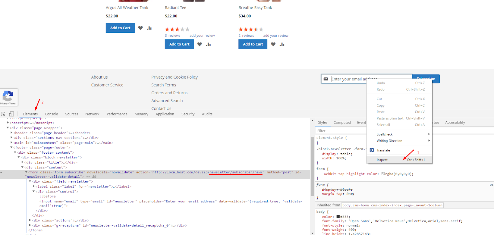 Step 4: In the Subscriber Form in the Action field, copy the URL path. (In this example, the URL is "newsletter/subscriber/new/")