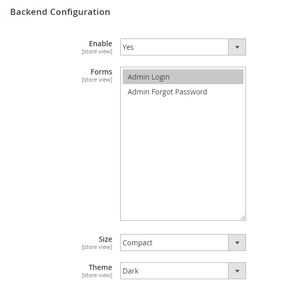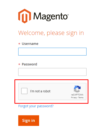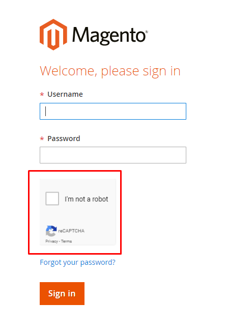 - Forms = Admin Login: reCAPTCHA will display in the Admin Login Form when store owners log into the admin page