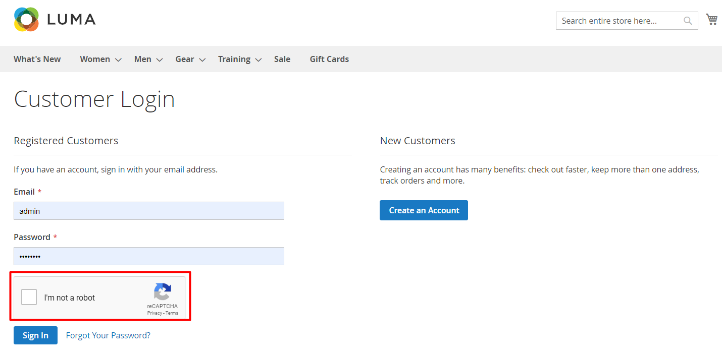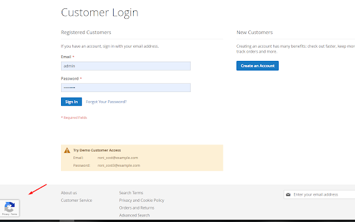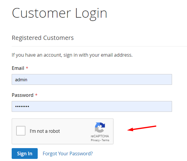 - Forms = Forgot Password: reCAPTCHA will show in the Forgot Password Form when customers access the website to get their password