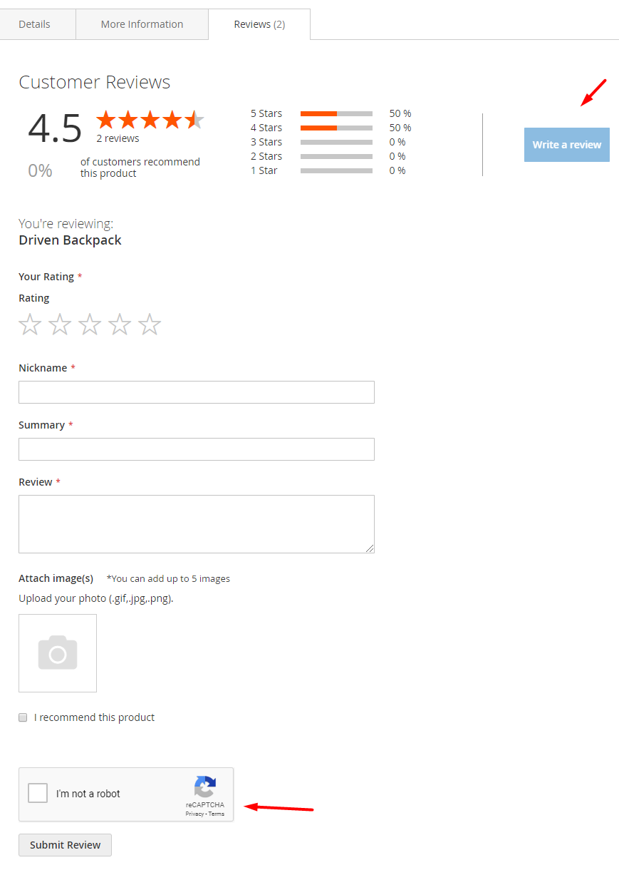 - Google Recaptcha is totally compatible with Better Product Reviews extension which supports customers to leave reviews to your product pages easily and accurately. Recaptcha will be shown when you click to Write a review button.
