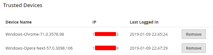 Yesto enable saving the trusted devices. In a certain period of time, when logging in with this device, admin users do not need to authenticate the two factors - This certain period is configured at Trusted Time field