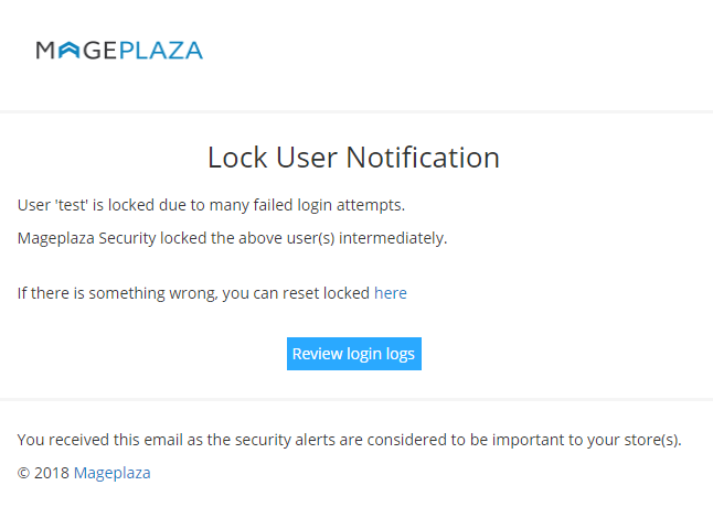 Store> Settings> Configuration> Advanced> Maximum Login Failures to Lockout Account), there will be a mail notification to the store owner that this account has been lock up. Store owner should review this case again to reset safety settings. You can refer this article to learn how to unlock an admin user account.