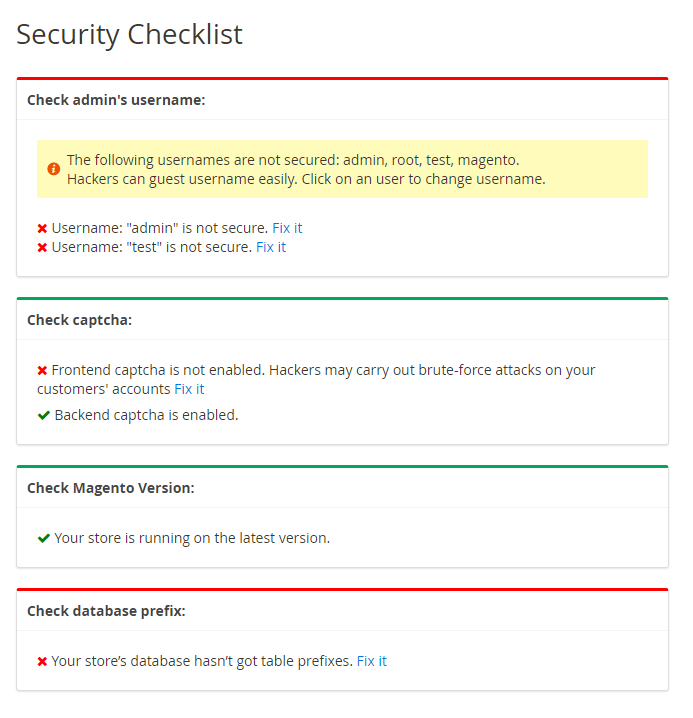 - In the Check Magento Version box: Check the version of Magento that the store owner is using. If this is not the latest version, the checklist will alert store owners to update to the latest version.