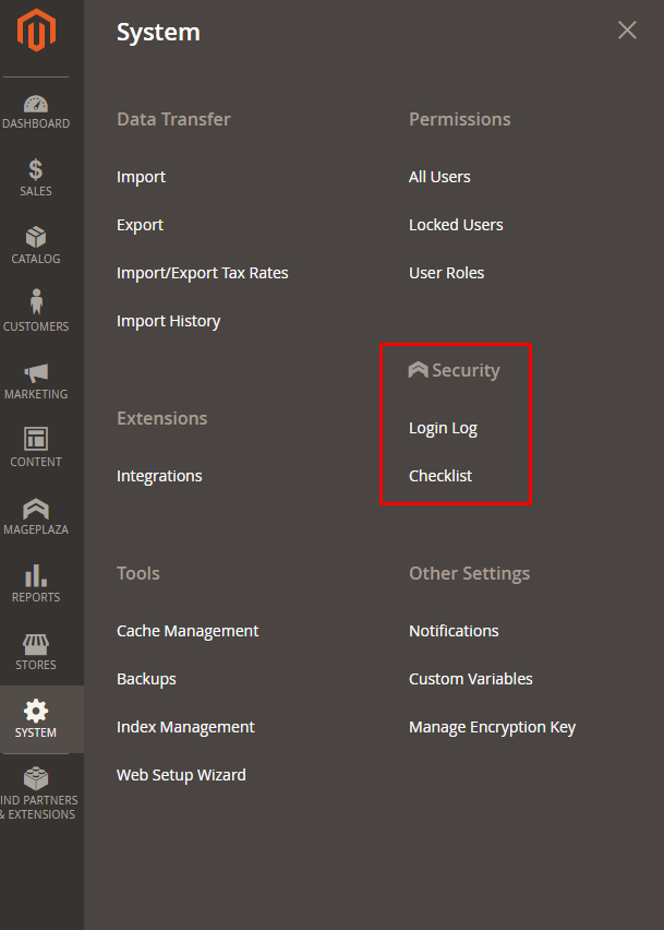 After logging in Magento backend, go to System > Security. We will provide detail guides to these bellow configuration