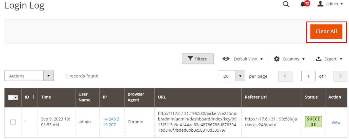 From the admin panel, make your way to System > Security > Login Log. All logins and login attempts will be recorded here. Click on the Clear All button to remove all the records of Login Log.