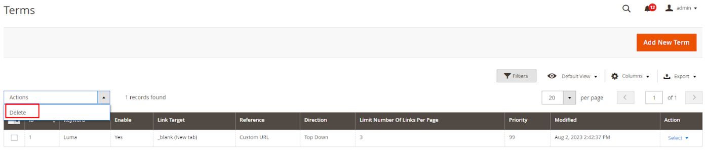 Follow Marketing > SEO > Manage Crosslinks. A list of existed terms will appear. Select in the Action button to customize the term you want to delete.