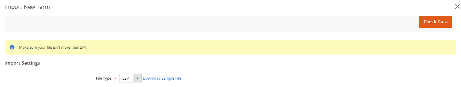 - In the Import New Term section, select File Type CSV and click Download Sample File that you want to download. The admin needs to download and edit the sample file so that it can be imported correctly.